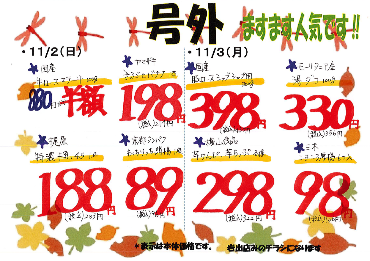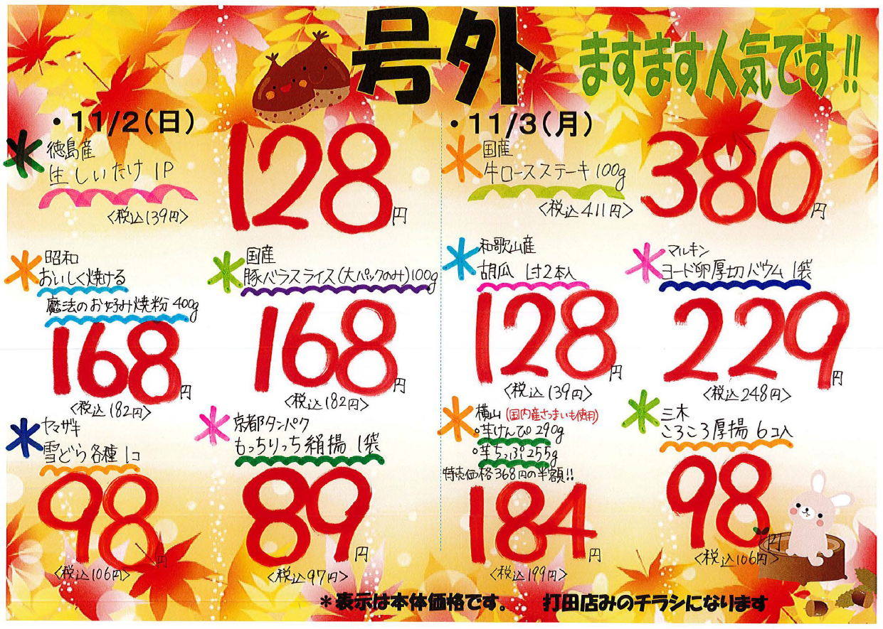 11月2日(日)・11月3日(月) 投稿: 2025年11月1日カテゴリー:チラシ, 号外 こんばんは‼️ スーパーネゴロです🐝 11月2日(日)・11月3日(月) ・*・*・*・*・* 各店限定 🌱号 外 チ ラ シ🌱 ・*・*・*・*・*・ 皆様のご来店を心よりお待ちしております🚚💨 【岩出店】 【打田店】