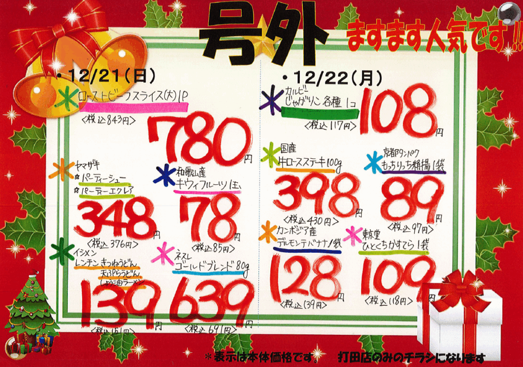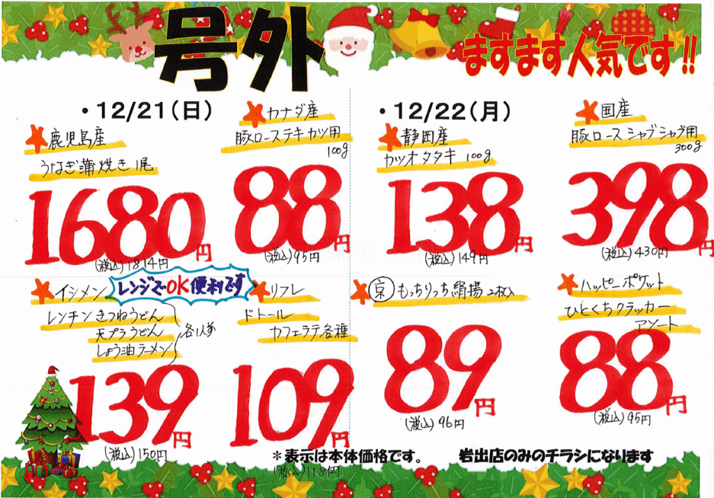 12月21日(日)・12月22日(月) 投稿: 2025年12月20日カテゴリー:号外, ニュース, チラシ こんばんは🤗 スーパーネゴロです🎅🫎 12月21日(日)・12月22日(月) ・*・*・*・*・* 各店限定 🎄号 外 チ ラ シ🎄 ・*・*・*・*・*・ 皆様のご来店を心よりお待ちしております🫡 【岩出店】 【打田店】