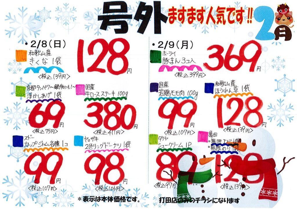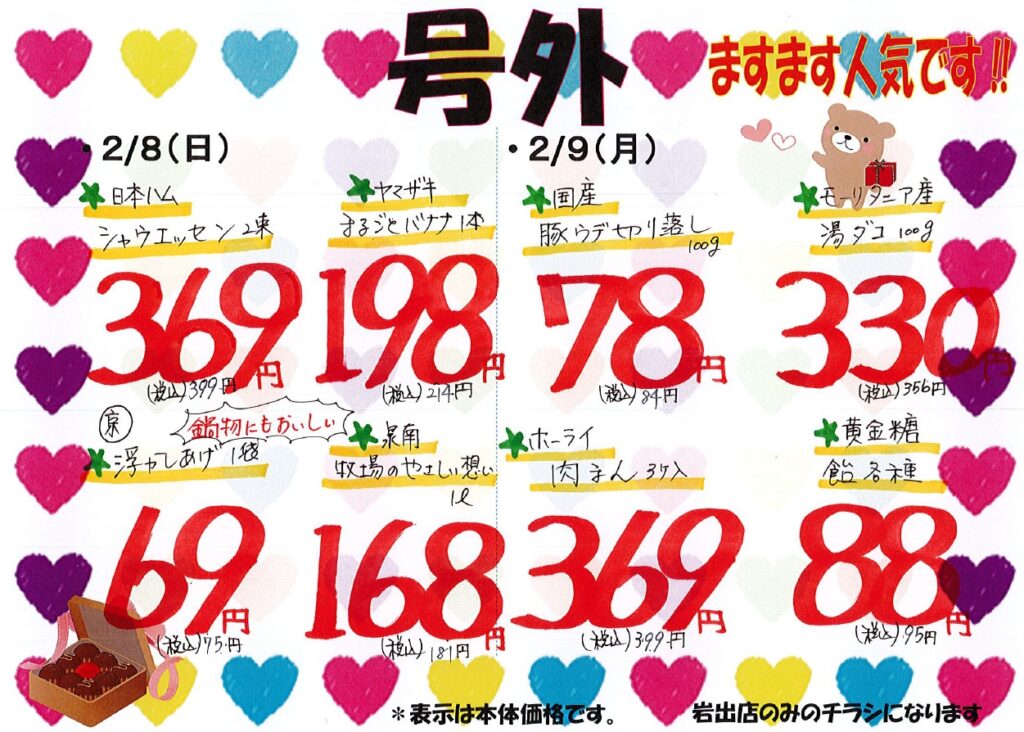2月8日(日)・2月9日(月) 投稿: 2026年2月7日カテゴリー:チラシ, 号外 こんばんは🐻 スーパーネゴロです☃️ 2月8日(日)・2月9日(月) ・*・*・*・*・*・ 各店限定 🍫号 外 チ ラ シ🍫 ・*・*・*・*・*・ 皆様のご来店を心よりお待ちしております🖐️ 【岩出店】 【打田店】