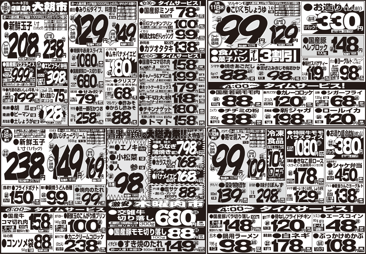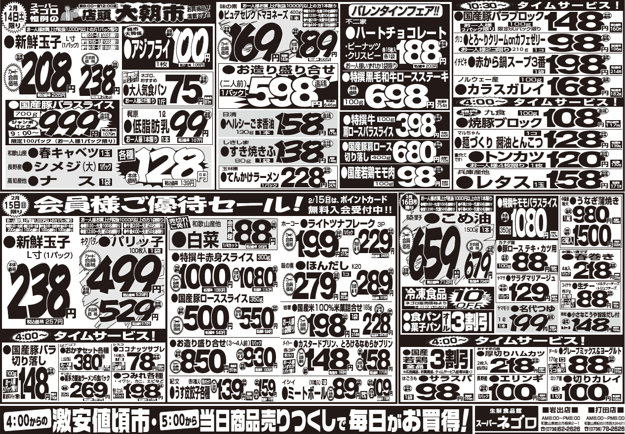 2月10日(火)~2月16日(月) 投稿: 2026年2月9日カテゴリー:チラシ こんばんは💗 スーパーネゴロです🫰 2月10日(火)~2月16日(月) ━━━━━━━━━━━━ 2月15日(日)限り 💑会員様ご優待セール💑 ※2/15(日)はポイントカード無料入会受付中⭕ ━━━━━━━━━━━━ 2/14(土)はバレンタインDAY💗バレンタインフェア開催🍫 皆さまのご来店心よりお待ちしております🚙💨