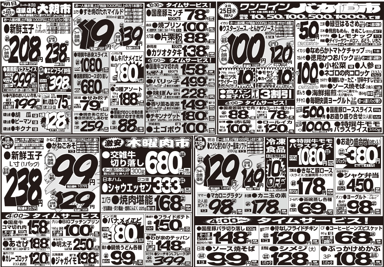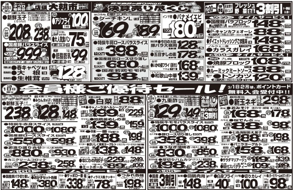 2月24日(火)~3月2日(月) 投稿: 2026年2月23日カテゴリー:チラシ こんばんは🐰 スーパーネゴロです💫 2月24日(火)~3月2日(月) ━━━━━━━━━━━━ 3月1日(日)限り 🐻会員様ご優待セール🐻❄️ ━━━━━━━━━━━━ \\2月28日(土) // 😶目玉商品が盛り沢山😶 決算売り尽くし‼️ 皆さまのご来店心よりお待ちしております🚌💨