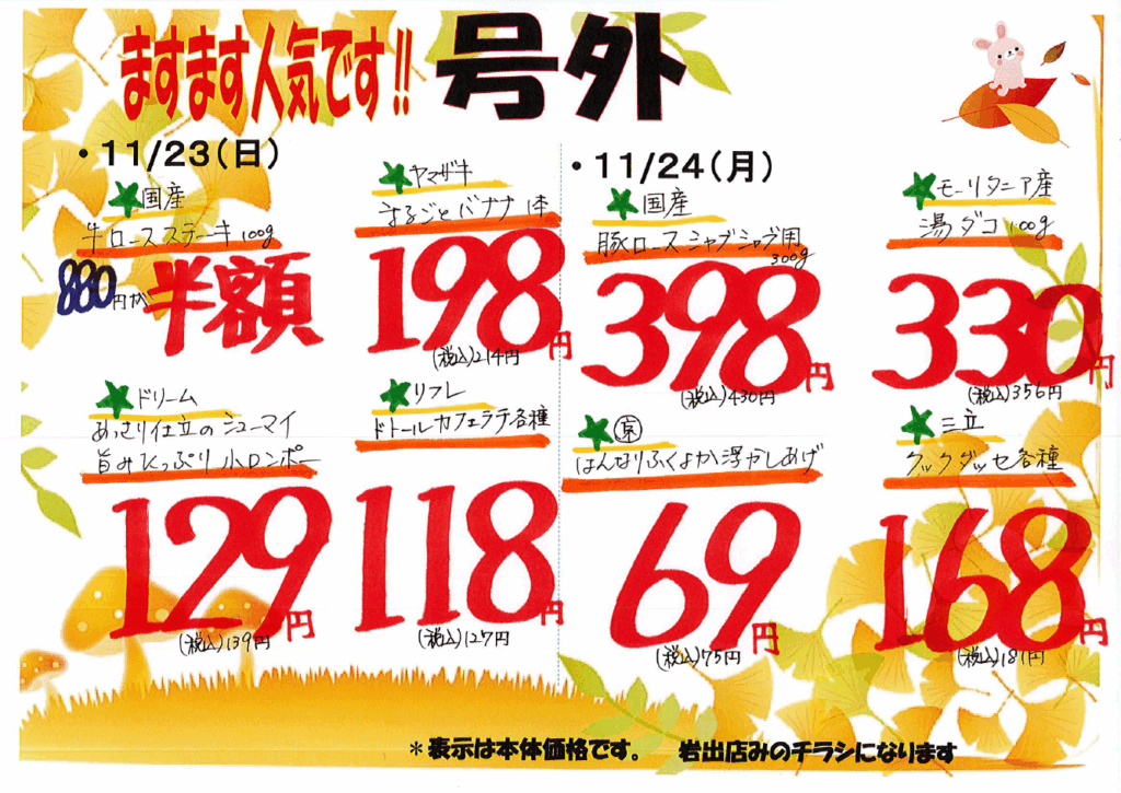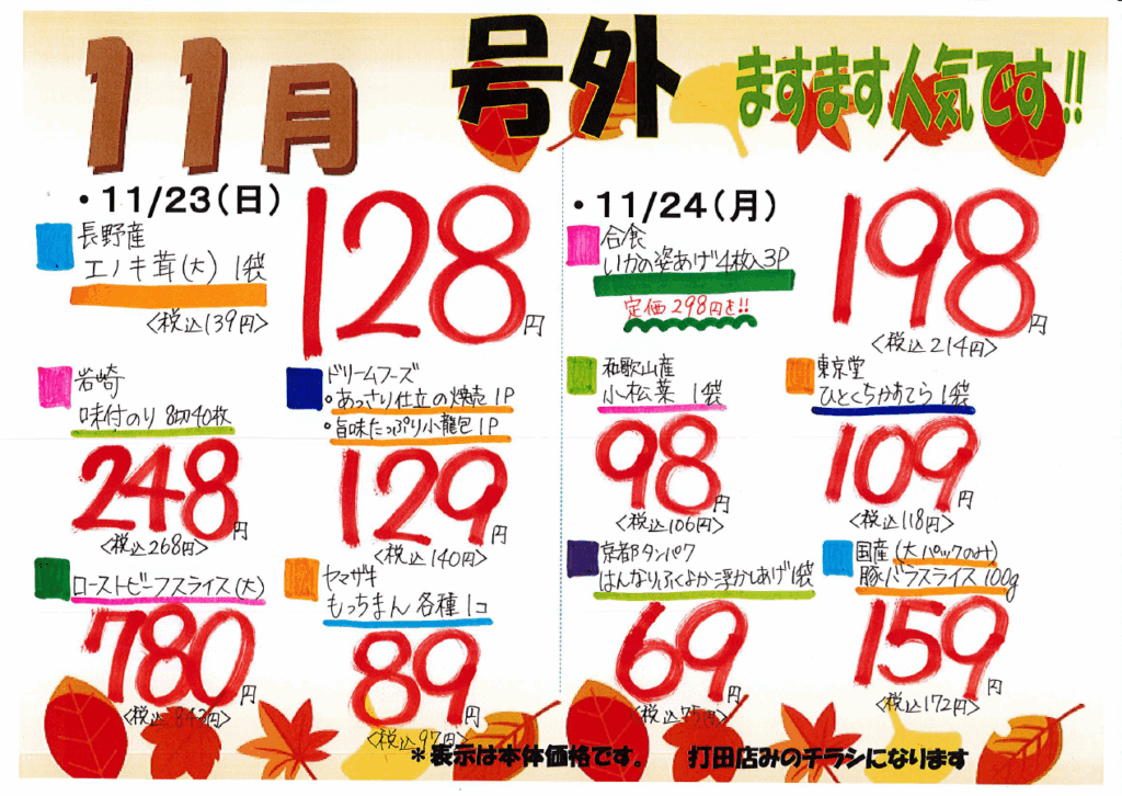 11/4(火)~11/6(木)の3日間に、ご来店くださり1回のお買い上げ金額が2,700円以上の方に、スタンプを捺印致します🤗スタンプが3日間分集まれば、500円の商品券をプレゼント🎁✨